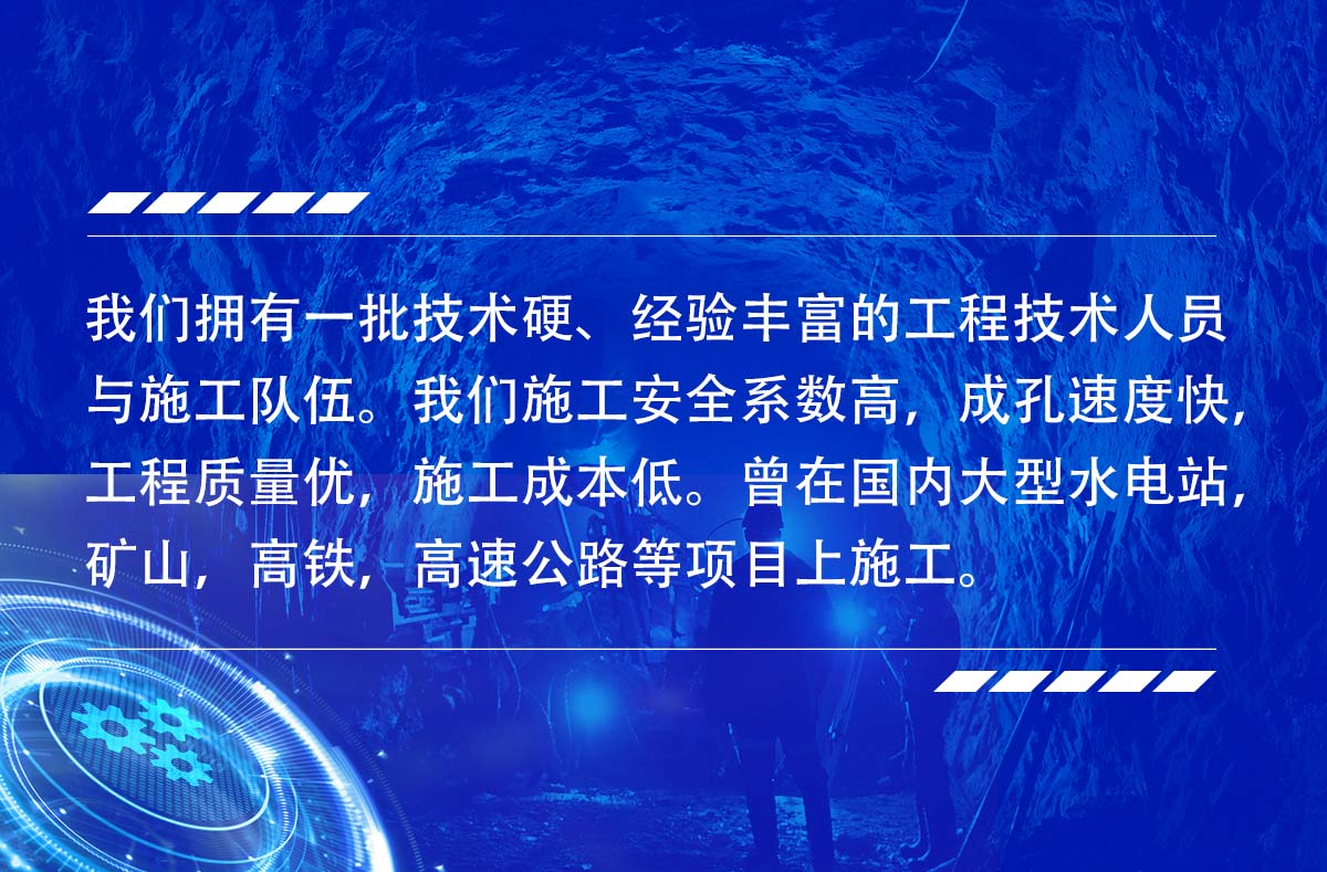 淮北市勤拓礦山工程有限公司是一家從事多年反井鉆機施工的服務(wù)生產(chǎn)型公司,公司目前有十幾臺鉆機設(shè)備,ZFY120/30/150型反井(天井)鉆機5臺,ZFY1.8/40/250型反井(天井)鉆機4臺,ZFY2.5/70/200型反井(天井)鉆機2臺,ZFY3.0/120/400型反井鉆機1臺,ZFY3.5/120/400型反井(天井)鉆機1臺,可承接深度0-300米,成孔直,0.9~4米.1.2~3米的各種豎井、井下煤倉、溜煤眼、通風(fēng)井、調(diào)壓井、電纜井、泄水井等。我們擁有一批技術(shù)硬、經(jīng)驗豐富的工程技術(shù)人員與施工隊伍。我們施工安全系數(shù)高,成孔速度快,工程質(zhì)量優(yōu),施工成本低。曾在國內(nèi)大型水電站,礦山,高鐵,高速公路等項目上施工。